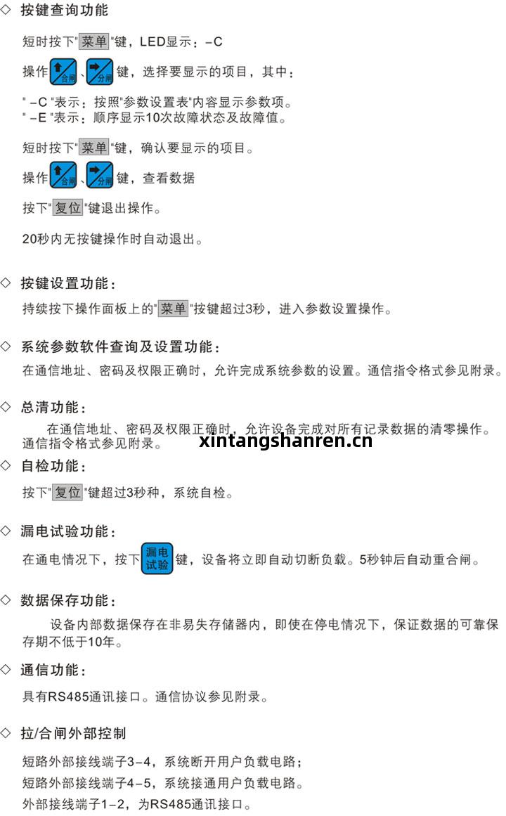 ◇ 自動重合閘:漏(lou)電(dian)、過(guo)壓、欠壓(ya)故(gu)障恢(hui)復後(hou)可自動重合閘。